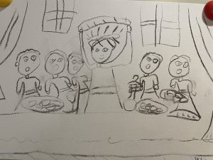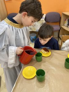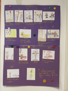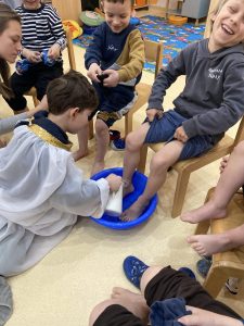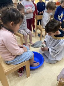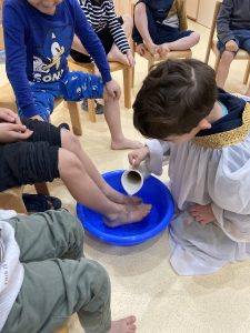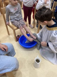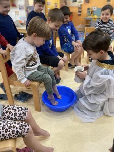U danima Velikoga tjedna posebno smo se zaustavili na Velikom četvrtku. Djeca su glumila Isusa i apostole te kroz dramatizaciju doživjela Posljednju večeru. Dijete koje je glumilo Isusa pralo je noge apostolima, lomilo kruh i dijelilo ga, čime su djeca na vrlo jednostavan, ali snažan način mogla razumjeti Isusovu ljubav, poniznost i služenje drugima. U velikoj dvorani zajedno smo, uz projekciju, gledali Posljednju večeru te razgovarali o Isusovoj ljubavi koja se daruje i služi.