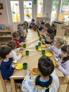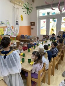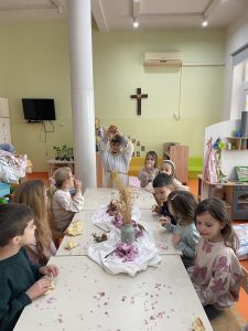 Pobožnost križnog puta proživjeli smo sabrano i mirno, primjereno dječjem uzrastu. Kroz kratke biblijske tekstove, molitvu i tišinu djeca su upoznala Isusov put ljubavi i žrtve. S puno ozbiljnosti, ali i topline, djeca su sudjelovala u svakoj postaji, pokazujući koliko mogu duboko doživjeti ono što im se približi na njima razumljiv način. No nismo ostali na Velikom petku i tužnim događajima, nego smo s djecom radosno slavili Uskrs, Isusovo uskrsnuće i pobjedu života. Razgovarali smo o praznom grobu, svjetlu, radosti i novom životu. Djeca su s velikim veseljem izrađivala uskrsne košare, ukrašavala jaja i kroz likovne aktivnosti izražavala radost Uskrsa. Uskrs smo doživjeli kao blagdan svjetla, nade i novoga početka, a dječja radost i uzbuđenje ispunili su vrtić posebnom toplinom. U svemu se osjećalo zajedništvo, radost stvaranja i međusobne blizine. Ovi dani bili su ispunjeni srećom, zajedništvom, ali i lijepom ozbiljnošću u važnim trenucima. Na djeci prihvatljiv i njima blizak način približili smo im najveću kršćansku radost Uskrs, pobjedu života, ljubavi i nade. U njihovim molitvama, osmijesima i malim dobrim djelima mogli smo vidjeti da je poruka Uskrsa dotaknula njihova srca.
