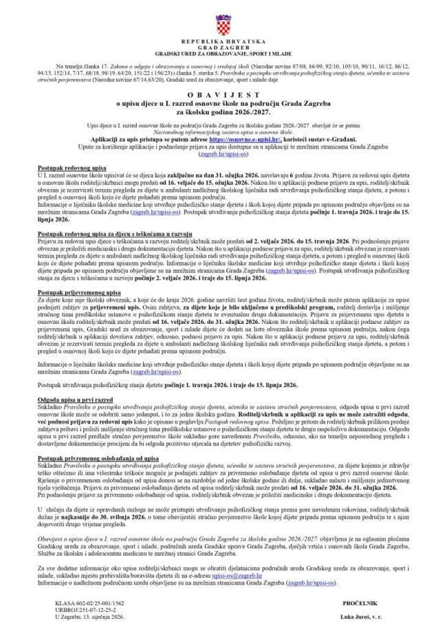 Obavijest o upisu djece u I. razred osnovne škole za školsku godinu 2026./2027.