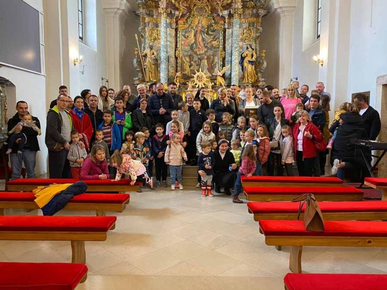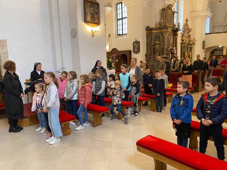 Pri dolasku pozdravili smo sestre franjevke Bosanko-hrvatske provincije koje djeluju na tom mjestu. Nakon toga uputili smo se na euharistijsko slavlje u 11 h u župnu crkvu Uznesenja Blažene Djevice Marije u Kloštru Ivaniću. Misno slavlje predslavio je župnik fra Robert Ćibarić, a djeca su svojim glasovima uljepšala slavlje. U svojoj propovijedi fra Robert se posebno obratio roditeljima i odgajateljima govoreći da su djeca puno otvorenijega i čišćega srca od nas odraslih te da treba paziti kako se odnosimo prema njima i koje riječi govorimo. No, naglasio je da više od svjesnoga ono naše ‘nesvjesno’ odgaja djecu. Također je istaknuo da je bitno dovesti dijete do Isusa. Poručio je roditeljima da, ako dovedu dijete do Isusa, ono nikada neće zaboraviti na svoje roditelje pa bili oni i najgori, upravo zato jer je upoznalo Isusa. Citirao je arapskog pjesnika Khalila Gibrana koji piše: „Vaša djeca nisu vaša djeca. Ona su sinovi i kćeri čežnje života za samim sobom. Ona dolaze kroz vas, ali ne od vas. I premda su s vama, ne pripadaju vama.“ Želio je time kazati roditeljima da djeca prvotno pripadaju Bogu koji je njihov Stvoritelj i koji ih najviše ljubi i najbolje poznaje.