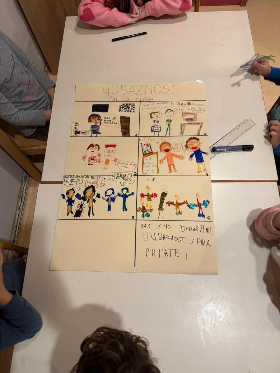 Dan smo završili izradom “plakata” – svako je dijete napisalo ili nacrtalo jednu ljubaznu poruku koju želimo širiti dalje. Naš plakat sada krasi hodnik vrtića kao podsjetnik da se ljubaznost može naučiti, ali se ponajviše osjeća i dijeli svakodnevno. Dan ljubaznosti još jednom nas je podsjetio koliko su sitne geste velike u dječjem svijetu te kako toplina, podrška i lijepa riječ čine naš vrtić sigurnim i radosnim mjestom za sve.
