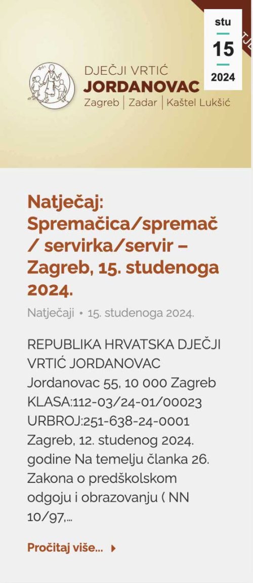 stu292024Natječaji - istekloVijesti DV Jordanovac – Zagreb Donosimo obavijesti o rezultatima natječaja za radna mjesta objavljenih l5. studenoga 2024. godine. Hvala svima na prijavama. Natječaj: Spremačica/spremač / servirka/servir – Zagreb, 15. studenoga 2024. Pdf dokument Ostale objaveBožji plan iznad ljudskih očekivanja17. prosinca 2025.Spavaj mali Božiću17. prosinca 2025.Sveta Lucija u znaku svjetla, tradicije i dječjeg stvaralaštva12. prosinca 2025.Adventsko druženje sa s. Anom11. prosinca 2025.DOLAZAK SV. NIKOLE11. prosinca 2025.Paljenje prve adventske svijeće1. prosinca 2025.